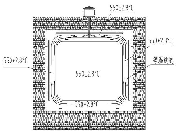 等溫?zé)犸L(fēng)循環(huán)系統(tǒng)把等溫?zé)犸L(fēng)通道內(nèi)的等溫?zé)犸L(fēng)從爐膛的頂部吹入爐膛,爐內(nèi)的熱風(fēng)從爐底的等溫?zé)犸L(fēng)通道循環(huán)進(jìn)入爐膛兩側(cè)的等溫?zé)犸L(fēng)通道,形成等溫?zé)犸L(fēng)循環(huán),是實(shí)現(xiàn)溫度均勻性≦±5℃的可靠保證。